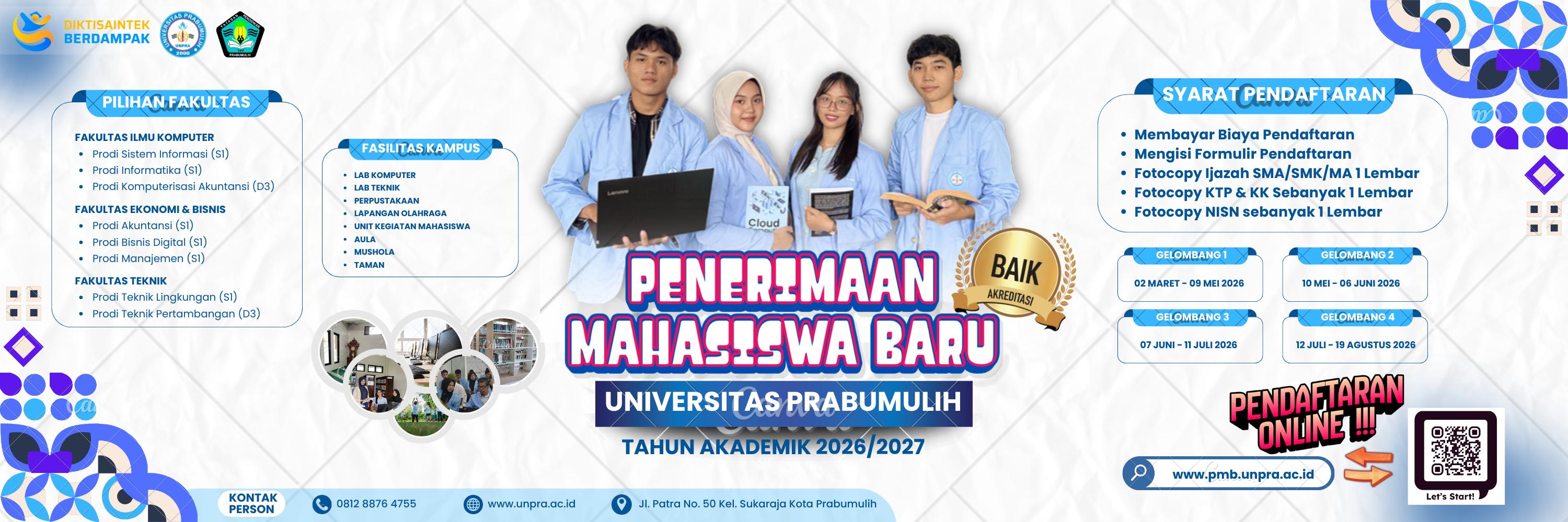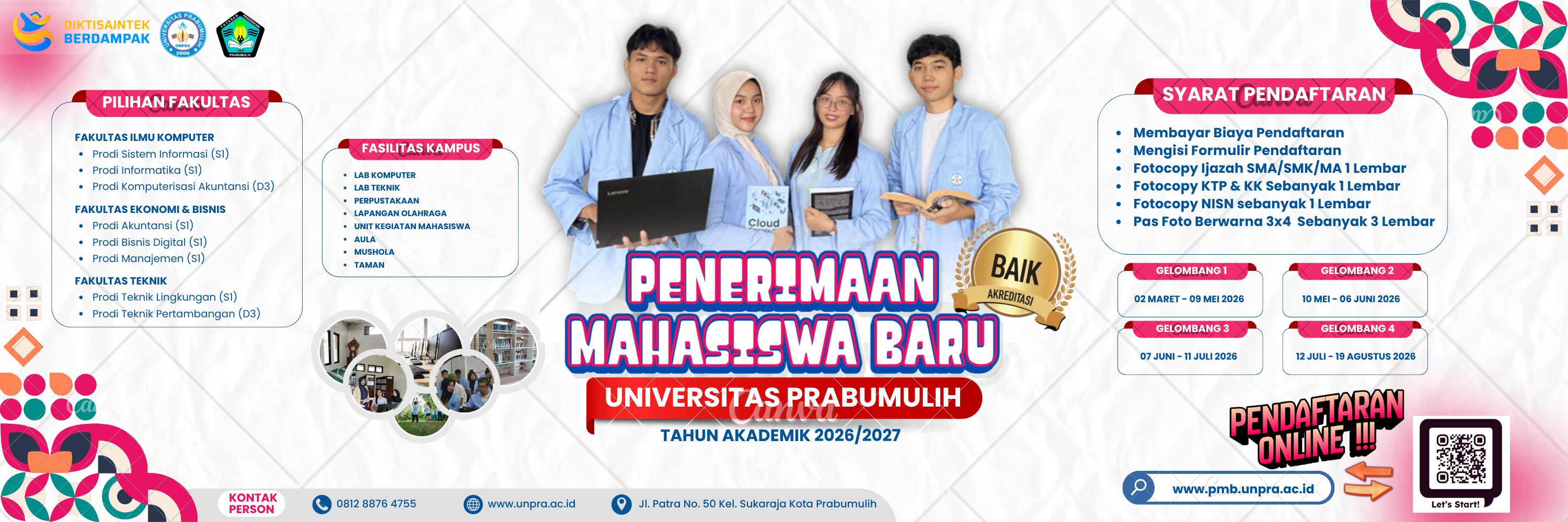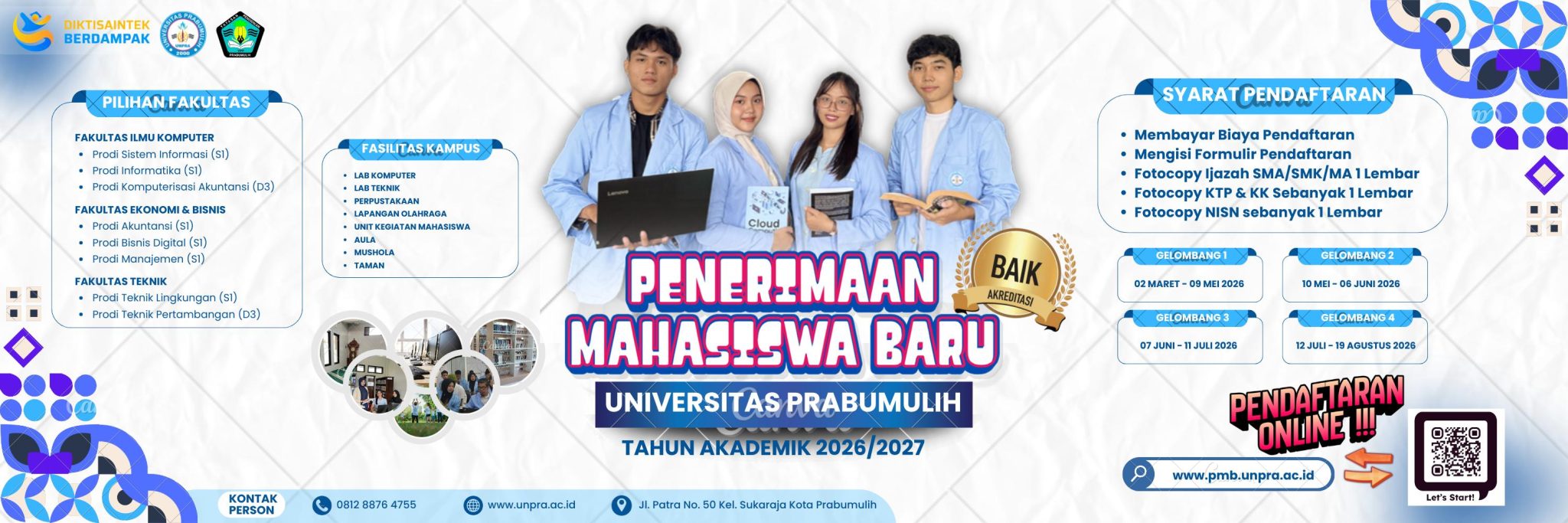 Selamat datang di Universitas Prabumulih (UNPRA), tempat Anda dapat mulai membuat perubahan nyata. Sebagai satu-satunya universitas di Prabumulih, Universitas Prabumulih berupaya untuk memfasilitasi generasi muda dari seluruh penjuru negeri dan dunia untuk mengembangkan diri dan memaksimalkan potensi yang dimiliki.